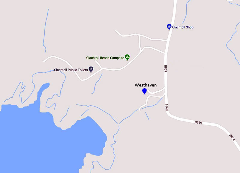 DIRECTIONS BY ROAD - From the South, drive from Inverness. Follow the A9 Northward then West on the A835 via Ullapool to Ledmore Junction. Turn left onto the A387 to Lochinver, Just before you come to Lochinver turn right on to the B869, you will see Westhaven on the left just after you enter Clachtoll.